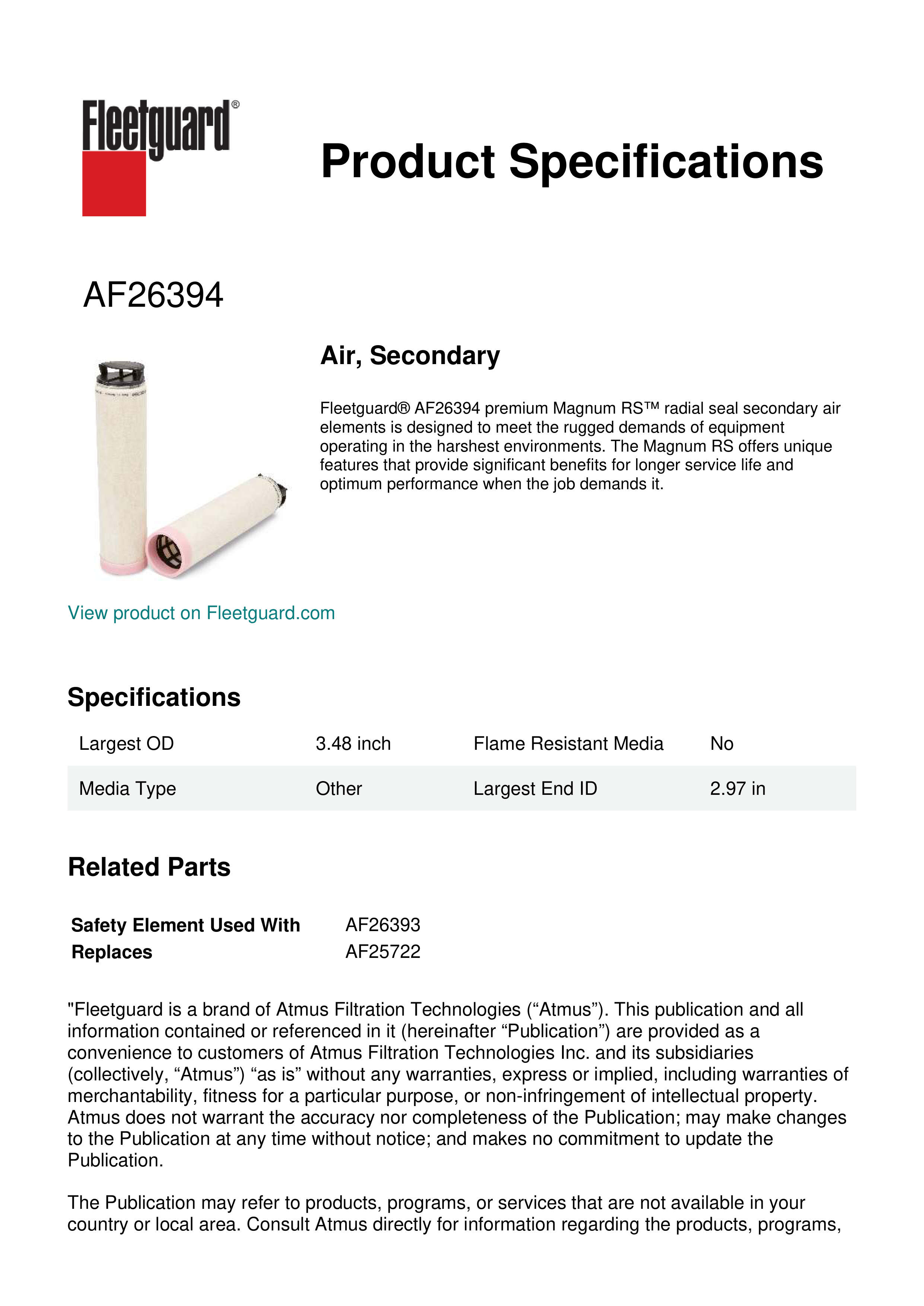 Fleetguard® AF26394 premium Magnum RS™ radial seal secondary air elements is designed to meet the rugged demands of equipment operating in the harshest environments. The Magnum RS offers unique features that provide significant benefits for longer service life and optimum performance when the job demands it.Specification