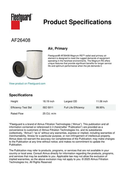 Fleetguard® AF26408 Magnum RS™ radial seal primary air element is designed to meet the rugged demands of equipment operating in the harshest environments. The Magnum RS offers unique features that provide significant benefits for longer service life and optimum performance when the job demands it.