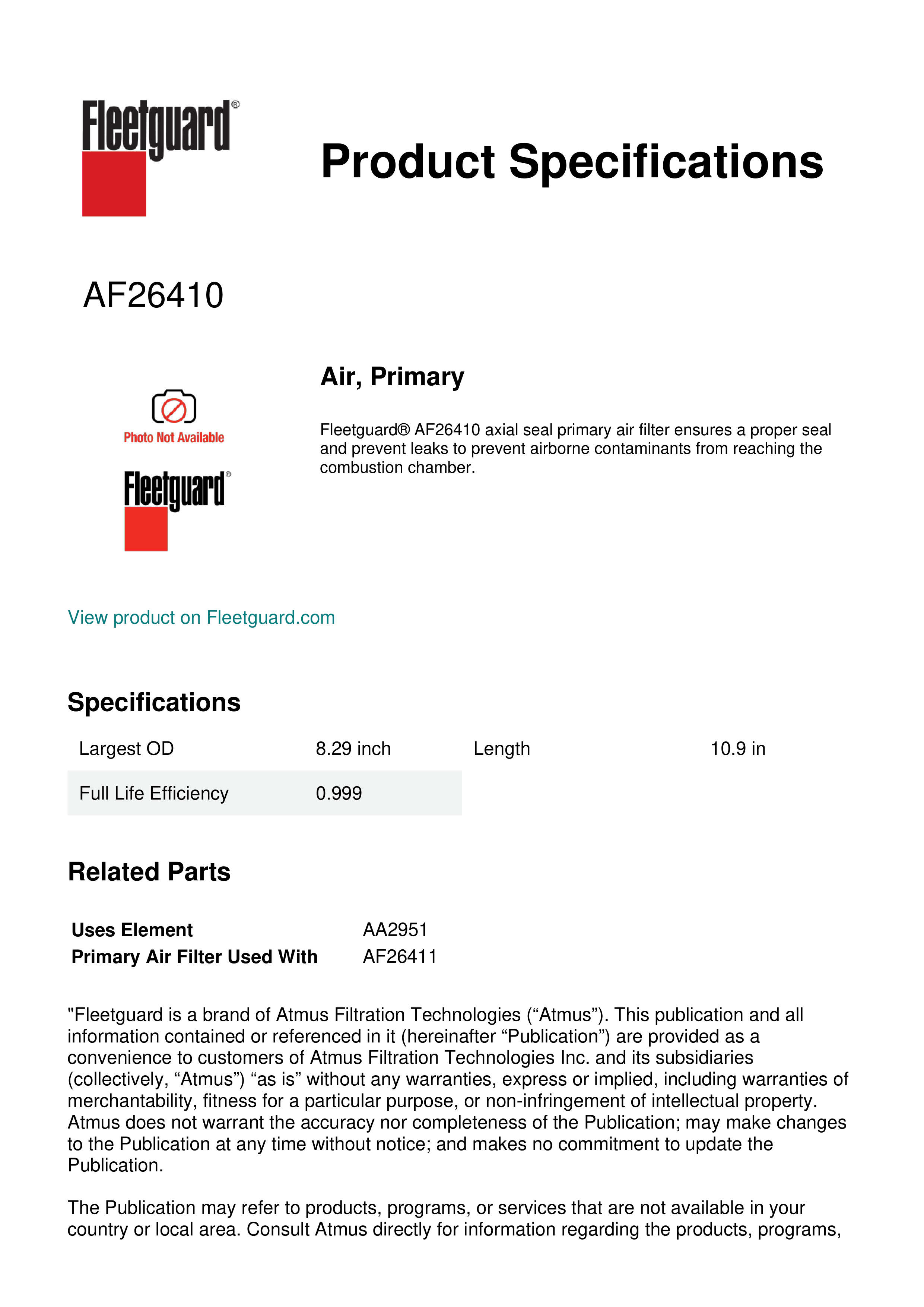 Fleetguard® AF26410 axial seal primary air filter ensures a proper seal and prevent leaks to prevent airborne contaminants from reaching the combustion chamber.
