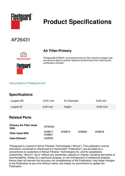 Fleetguard® AF26431 axial seal primary air filter ensures a proper seal and prevent leaks to prevent airborne contaminants from reaching the combustion chamber.Specification