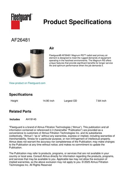 Fleetguard® AF26481 Magnum RS™ radial seal primary air element is designed to meet the rugged demands of equipment operating in the harshest environments. The Magnum RS offers unique features that provide significant benefits for longer service life and optimum performance when the job demands it.Specification