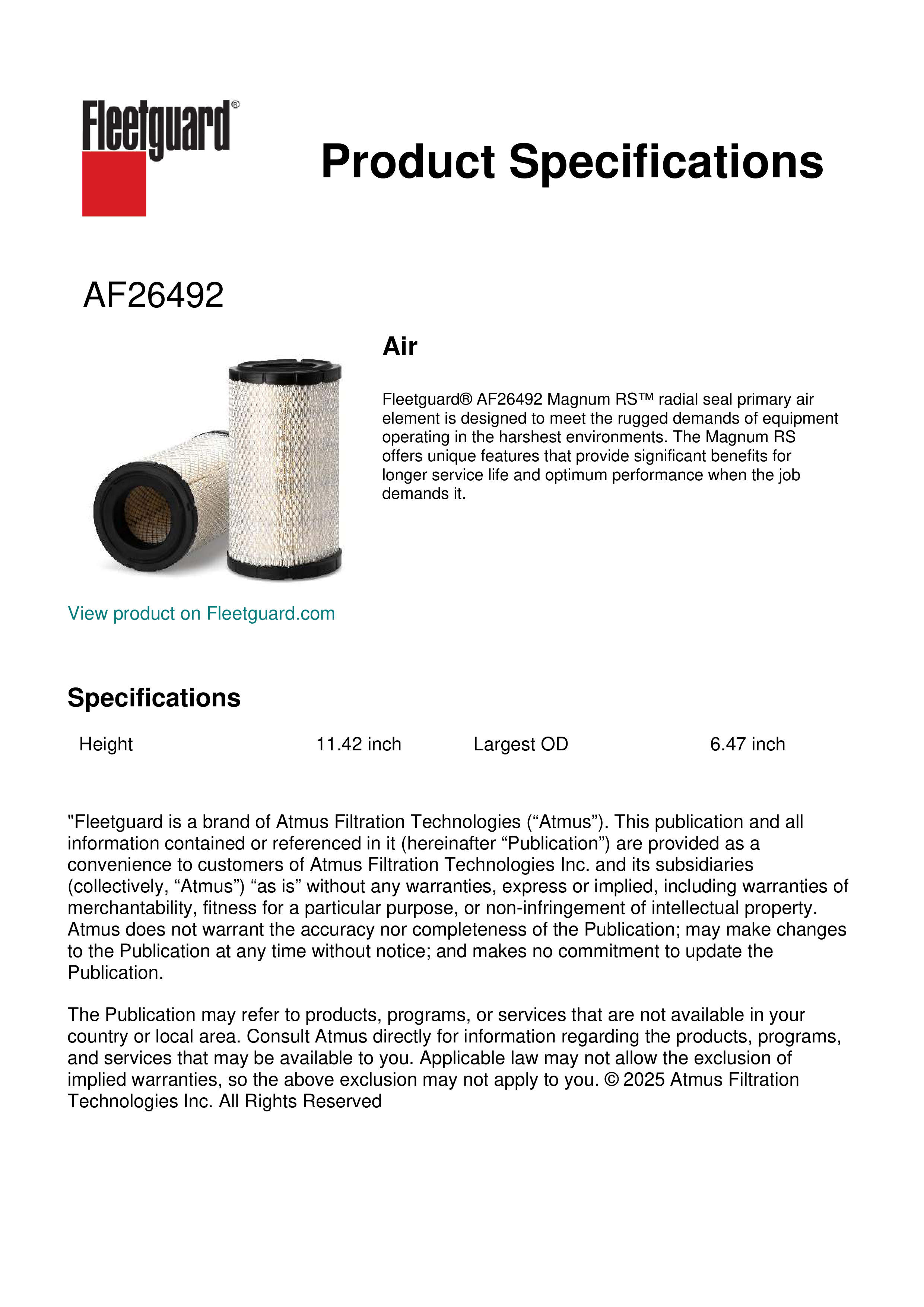 Fleetguard® AF26492 Magnum RS™ radial seal primary air element is designed to meet the rugged demands of equipment operating in the harshest environments. The Magnum RS offers unique features that provide significant benefits for longer service life and optimum performance when the job demands it.Specification