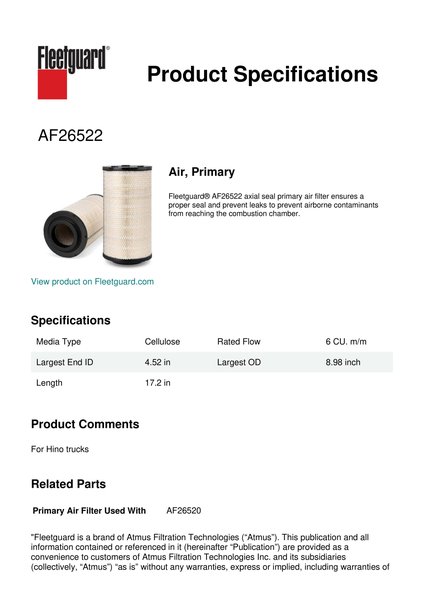 Fleetguard® AF26522 axial seal primary air filter ensures a proper seal and prevent leaks to prevent airborne contaminants from reaching the combustion chamber.