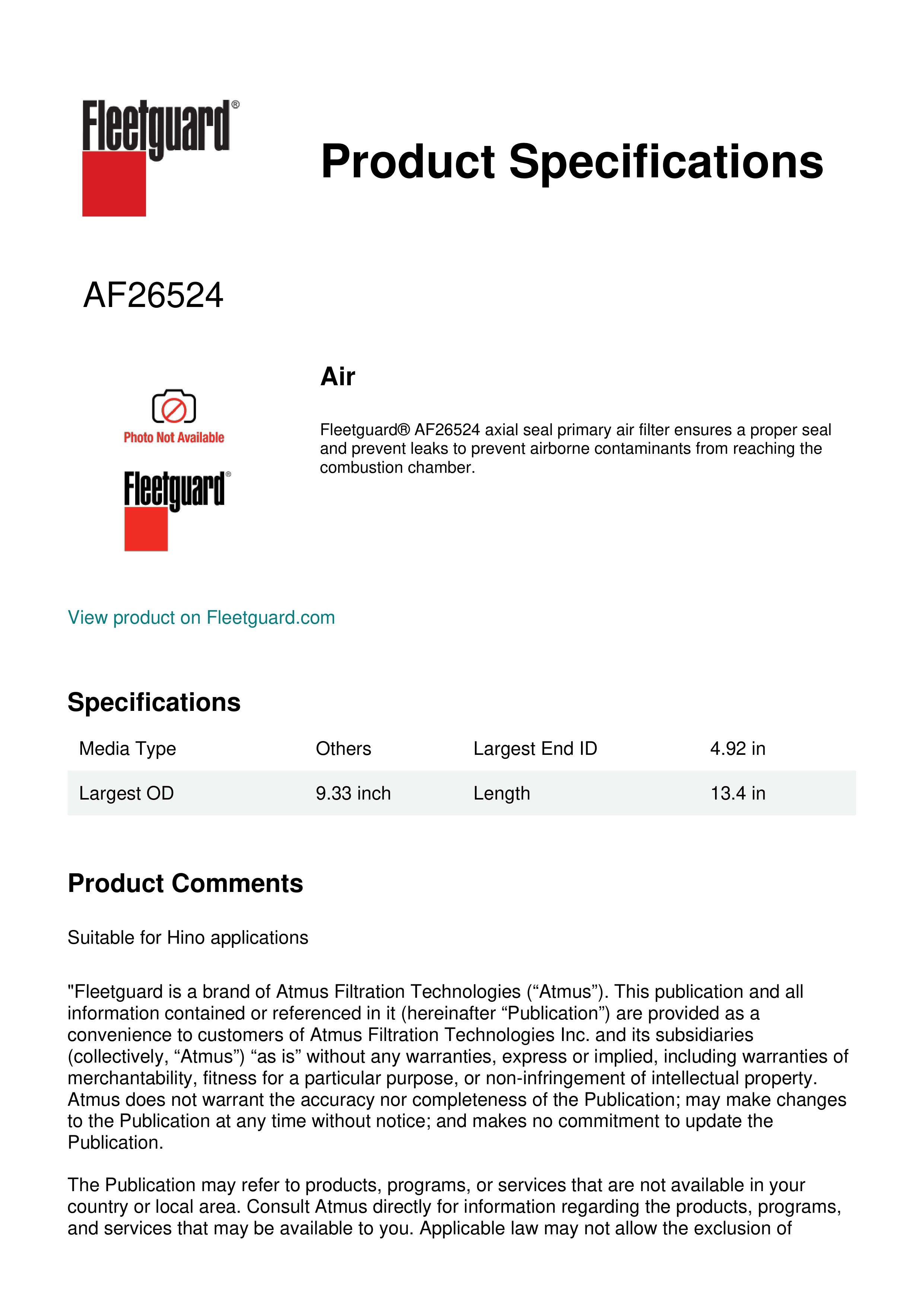 Fleetguard® AF26524 axial seal primary air filter ensures a proper seal and prevent leaks to prevent airborne contaminants from reaching the combustion chamber.Specification