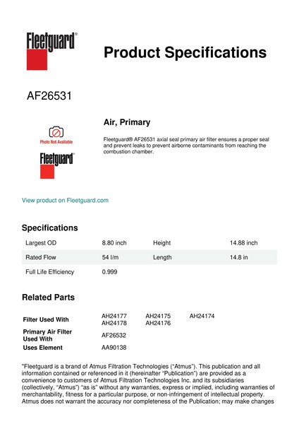 Fleetguard® AF26531 axial seal primary air filter ensures a proper seal and prevent leaks to prevent airborne contaminants from reaching the combustion chamber.