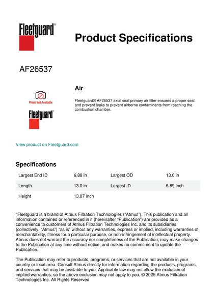 Fleetguard® AF26537 axial seal primary air filter ensures a proper seal and prevent leaks to prevent airborne contaminants from reaching the combustion chamber.
