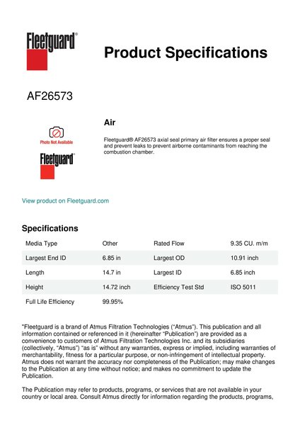 Fleetguard® AF26573 axial seal primary air filter ensures a proper seal and prevent leaks to prevent airborne contaminants from reaching the combustion chamber.