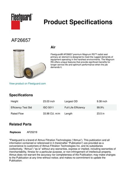 Fleetguard® AF26657 premium Magnum RS™ radial seal primary air element is designed to meet the rugged demands of equipment operating in the harshest environments. The Magnum RS offers unique features that provide significant benefits for longer service life and optimum performance when the job demands it.Specification