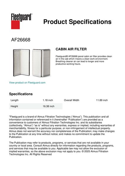 Fleetguard® AF26668 panel cabin air filter provides clean air in the cab which means a clean work environment. Breathing cleaner air can lead to longer and more productive working hours.Specification
