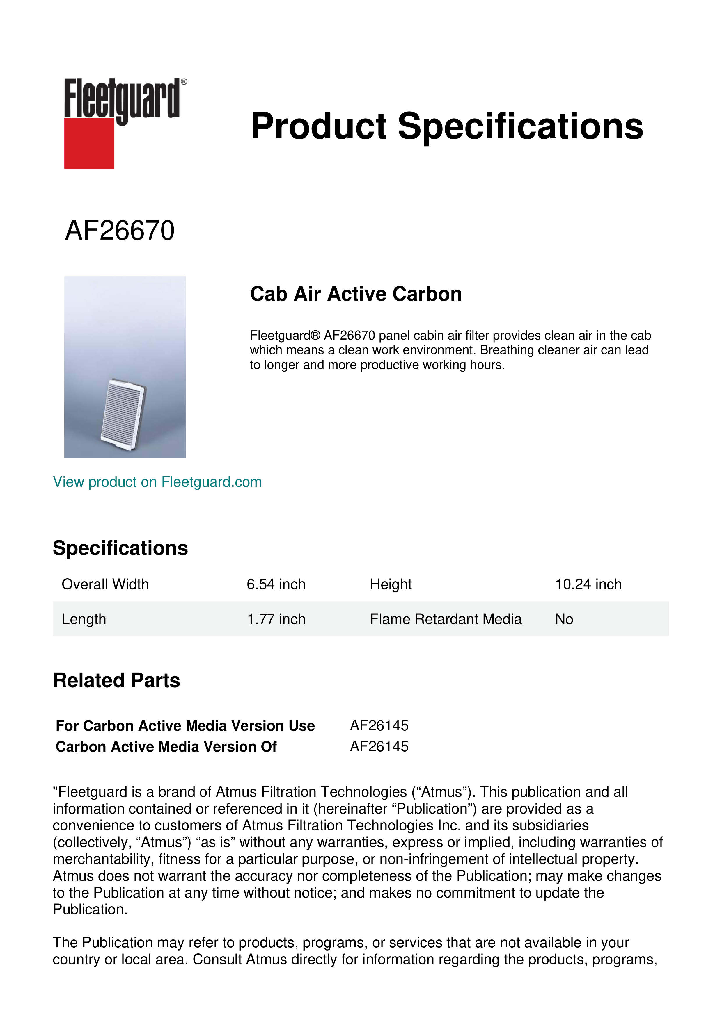 Fleetguard® AF26670 panel cabin air filter provides clean air in the cab which means a clean work environment. Breathing cleaner air can lead to longer and more productive working hours.Specification