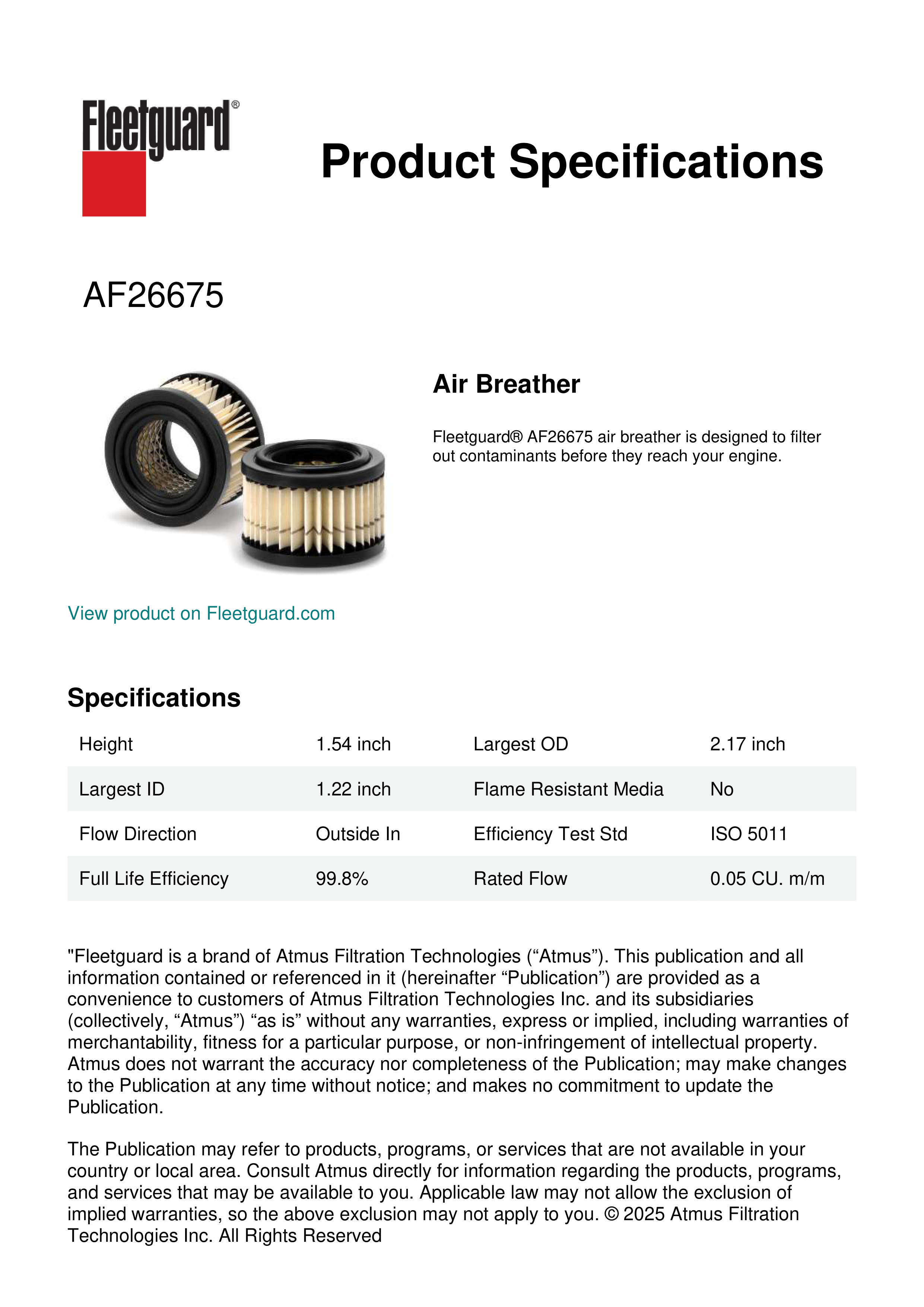Fleetguard® AF26675 air breather is designed to filter out contaminants before they reach your engine.Specification