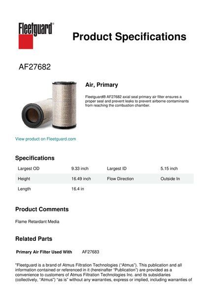 Fleetguard® AF27682 axial seal primary air filter ensures a proper seal and prevent leaks to prevent airborne contaminants from reaching the combustion chamber.