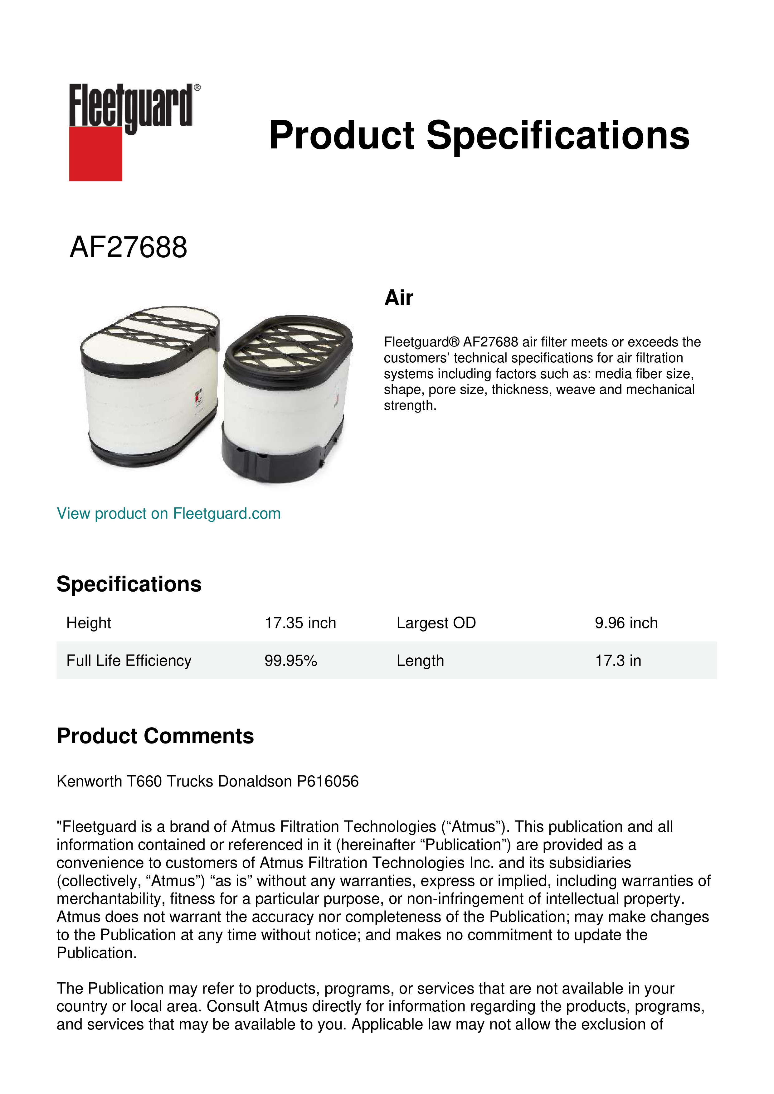 Fleetguard® AF27688 air filter meets or exceeds the customers’ technical specifications for air filtration systems including factors such as: media fiber size, shape, pore size, thickness, weave and mechanical strength.
