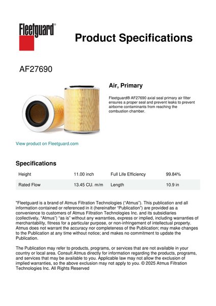 Fleetguard® AF27690 axial seal primary air filter ensures a proper seal and prevent leaks to prevent airborne contaminants from reaching the combustion chamber.