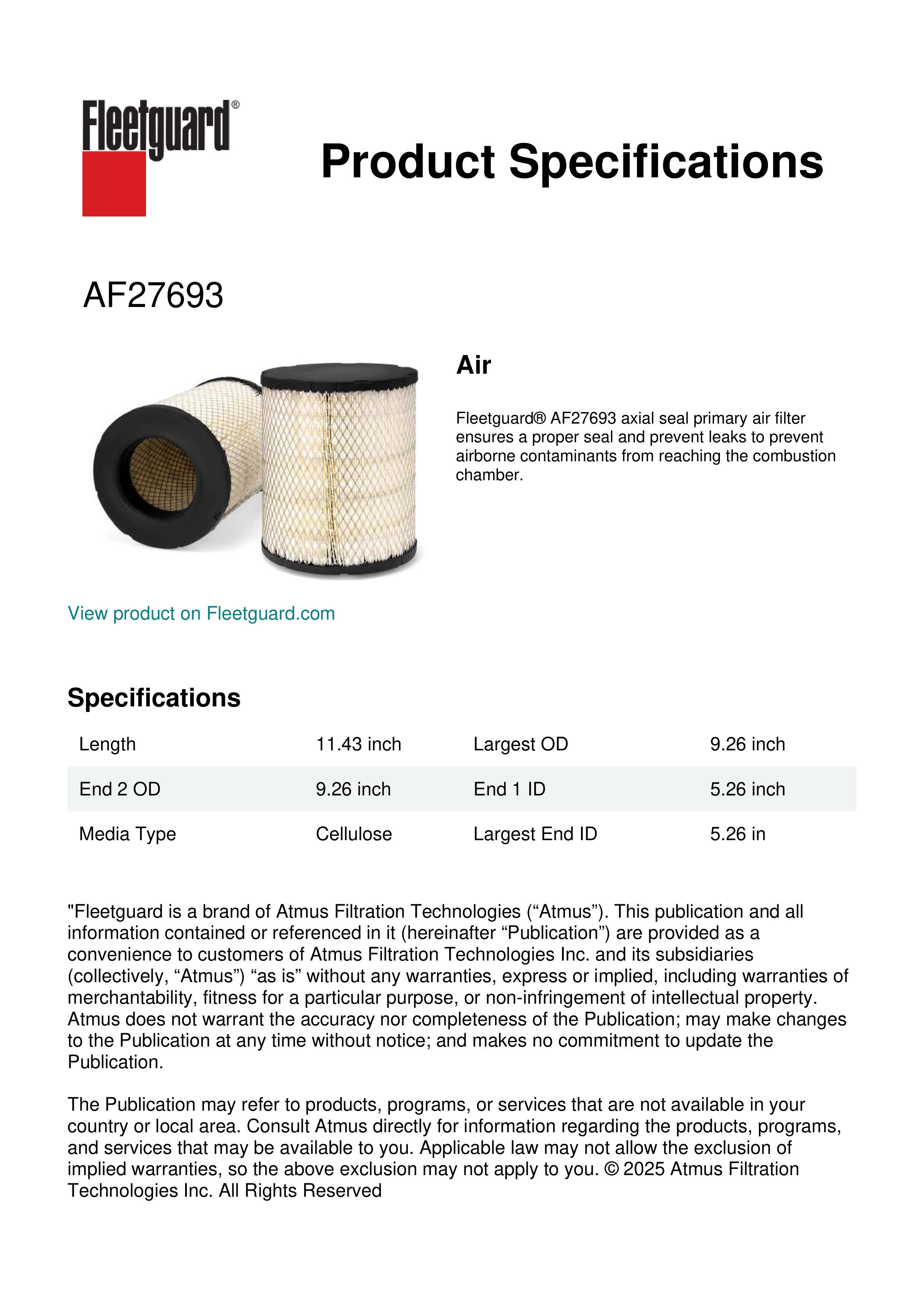 Fleetguard® AF27693 axial seal primary air filter ensures a proper seal and prevent leaks to prevent airborne contaminants from reaching the combustion chamber.