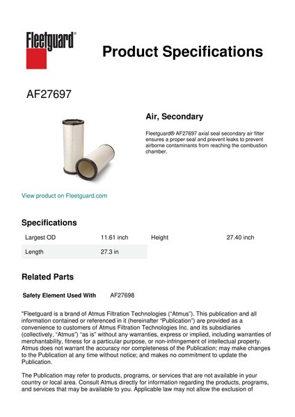 Fleetguard® AF27697 axial seal secondary air filter ensures a proper seal and prevent leaks to prevent airborne contaminants from reaching the combustion chamber.