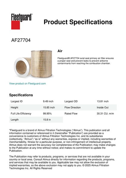 Fleetguard® AF27704 axial seal primary air filter ensures a proper seal and prevent leaks to prevent airborne contaminants from reaching the combustion chamber.