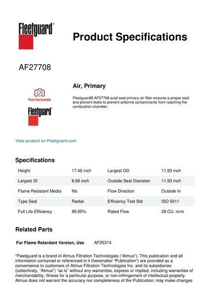 Fleetguard® AF27708 axial seal primary air filter ensures a proper seal and prevent leaks to prevent airborne contaminants from reaching the combustion chamber.