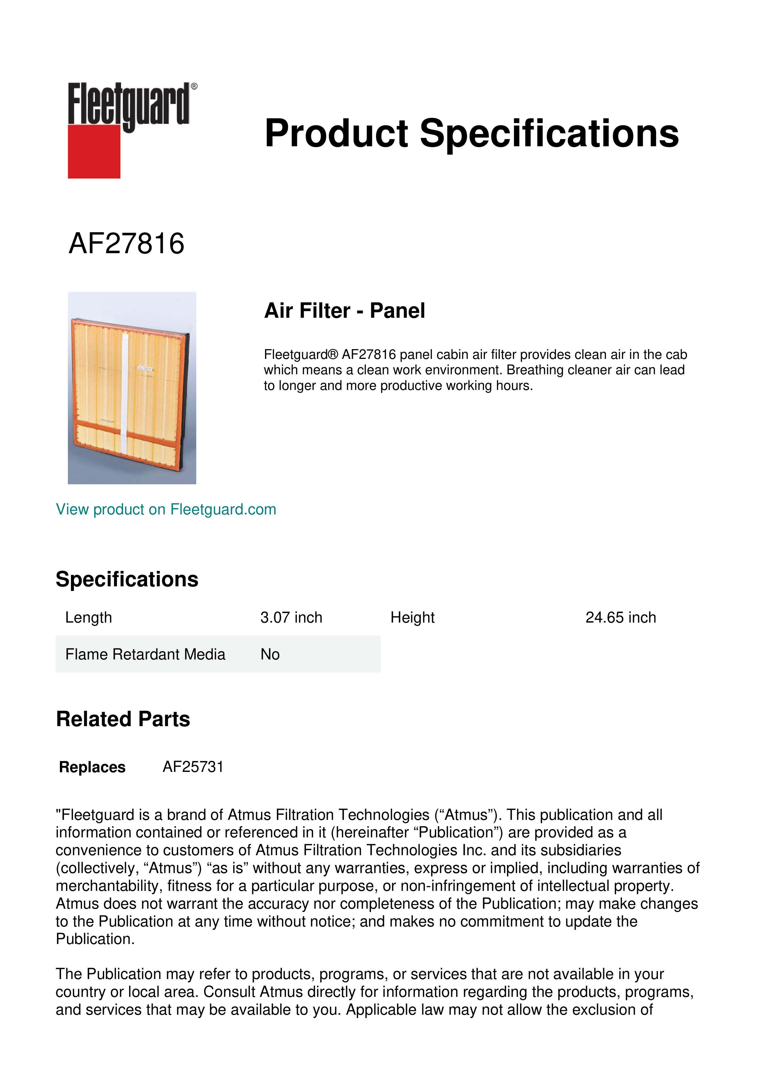 Fleetguard® AF27816 panel cabin air filter provides clean air in the cab which means a clean work environment. Breathing cleaner air can lead to longer and more productive working hours.Specification