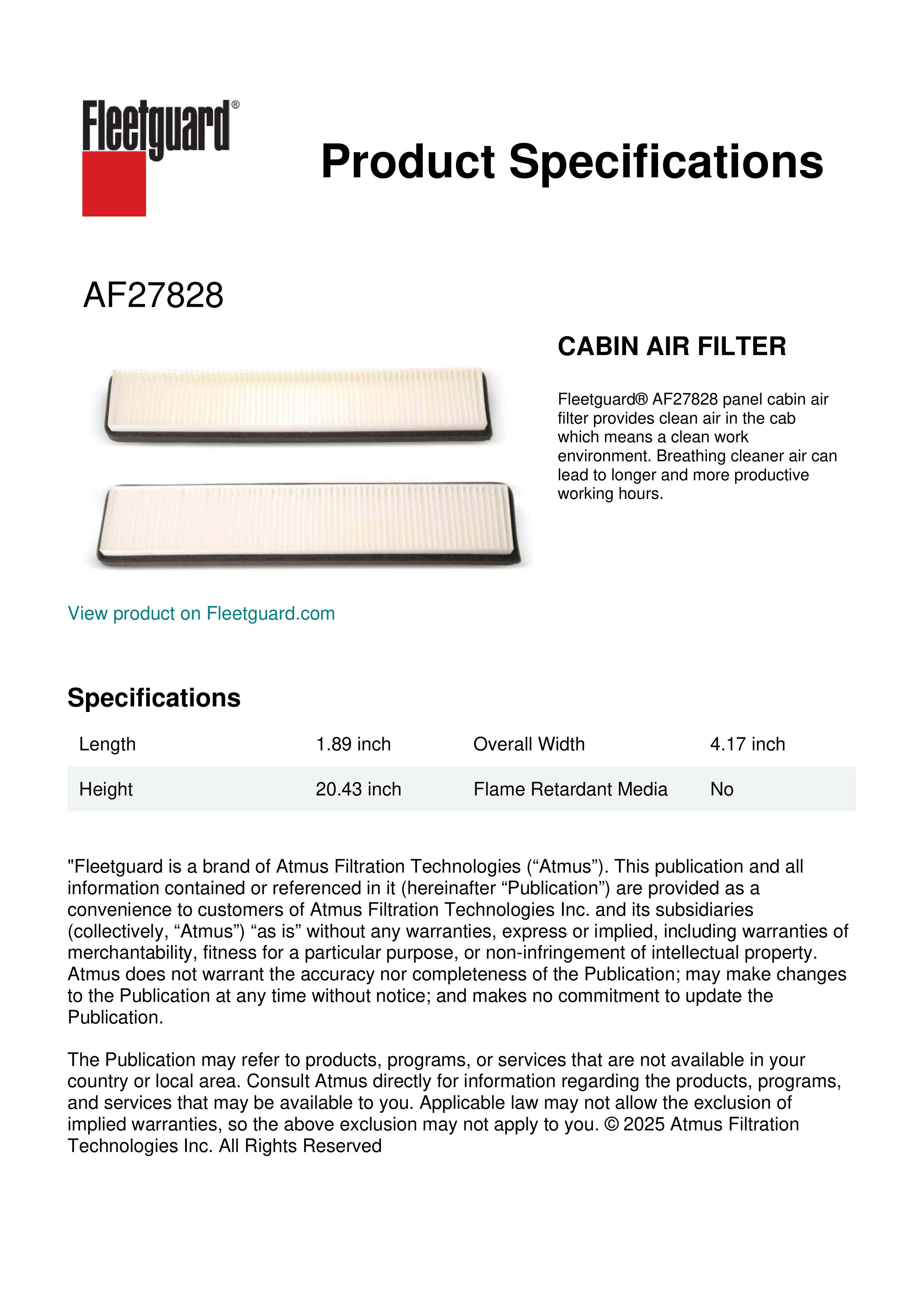 Fleetguard® AF27828 panel cabin air filter provides clean air in the cab which means a clean work environment. Breathing cleaner air can lead to longer and more productive working hours.Specification