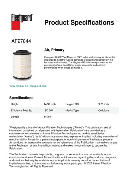 Fleetguard® AF27844 Magnum RS™ radial seal primary air element is designed to meet the rugged demands of equipment operating in the harshest environments. The Magnum RS offers unique features that provide significant benefits for longer service life and optimum performance when the job demands it.