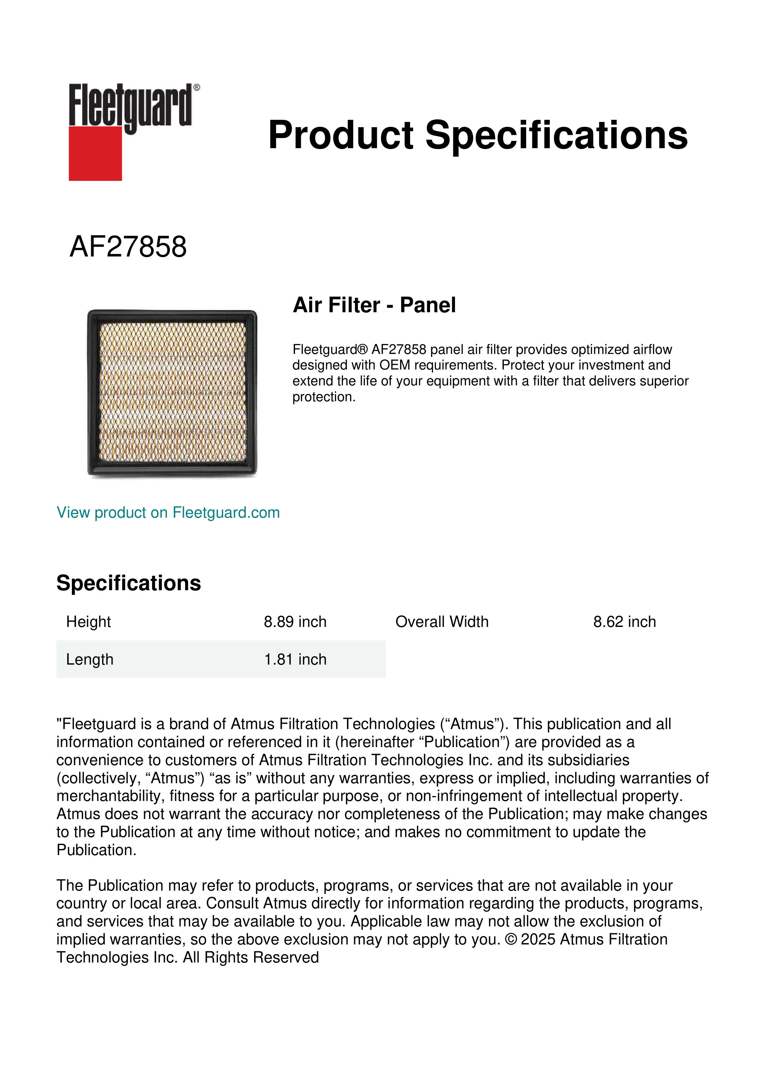 Fleetguard® AF27858 panel air filter provides optimized airflow designed with OEM requirements. Protect your investment and extend the life of your equipment with a filter that delivers superior protection.Specification