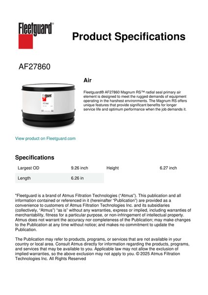 Fleetguard® AF27860 Magnum RS™ radial seal primary air element is designed to meet the rugged demands of equipment operating in the harshest environments. The Magnum RS offers unique features that provide significant benefits for longer service life and optimum performance when the job demands it.