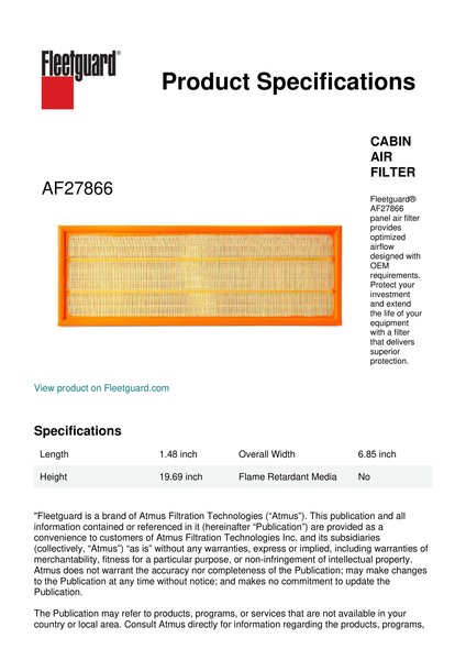 Fleetguard® AF27866 panel air filter provides optimized airflow designed with OEM requirements. Protect your investment and extend the life of your equipment with a filter that delivers superior protection.Specification
