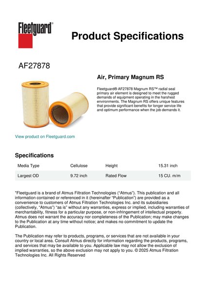 Fleetguard® AF27878 Magnum RS™ radial seal primary air element is designed to meet the rugged demands of equipment operating in the harshest environments. The Magnum RS offers unique features that provide significant benefits for longer service life and optimum performance when the job demands it.