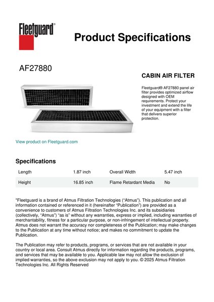 Fleetguard® AF27880 panel air filter provides optimized airflow designed with OEM requirements. Protect your investment and extend the life of your equipment with a filter that delivers superior protection.Specification