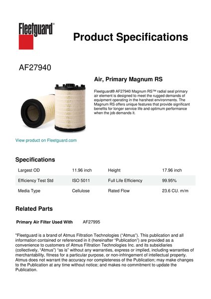 Fleetguard® AF27940 Magnum RS™ radial seal primary air element is designed to meet the rugged demands of equipment operating in the harshest environments. The Magnum RS offers unique features that provide significant benefits for longer service life and optimum performance when the job demands it.