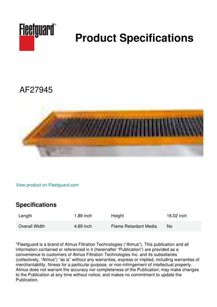 Fleetguard® AF27945 panel air filter provides optimized airflow designed with OEM requirements. Protect your investment and extend the life of your equipment with a filter that delivers superior protection.Specification