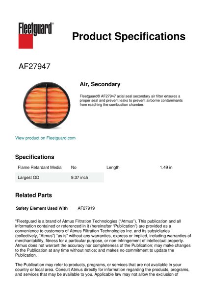 Fleetguard® AF27947 axial seal secondary air filter ensures a proper seal and prevent leaks to prevent airborne contaminants from reaching the combustion chamber.Specification