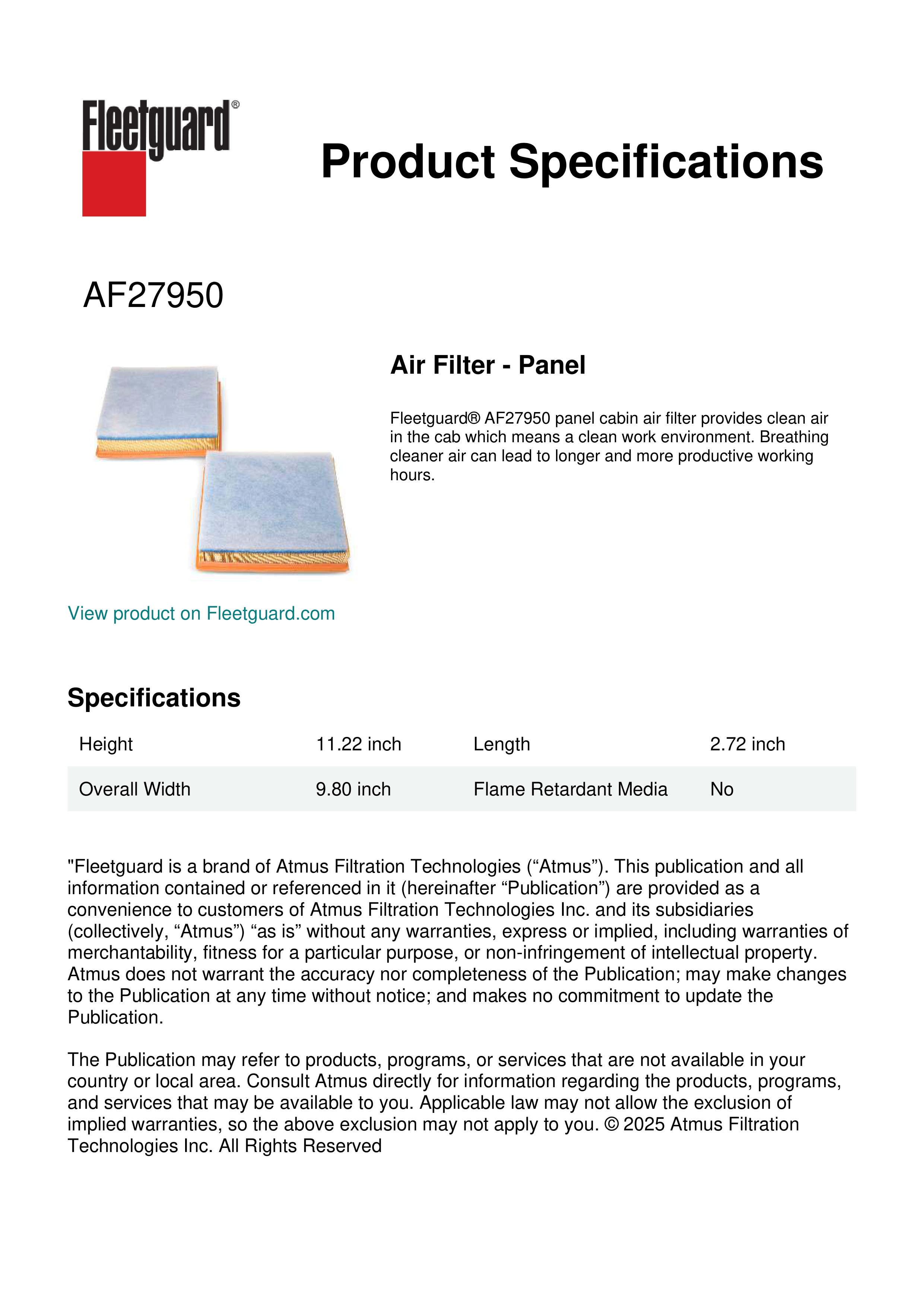 Fleetguard® AF27950 panel cabin air filter provides clean air in the cab which means a clean work environment. Breathing cleaner air can lead to longer and more productive working hours.Specification
