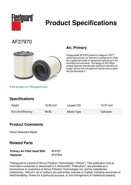 Fleetguard® AF27970 premium Magnum RS™ radial seal primary air element is designed to meet the rugged demands of equipment operating in the harshest environments. The Magnum RS offers unique features that provide significant benefits for longer service life and optimum performance when the job demands it.Specification