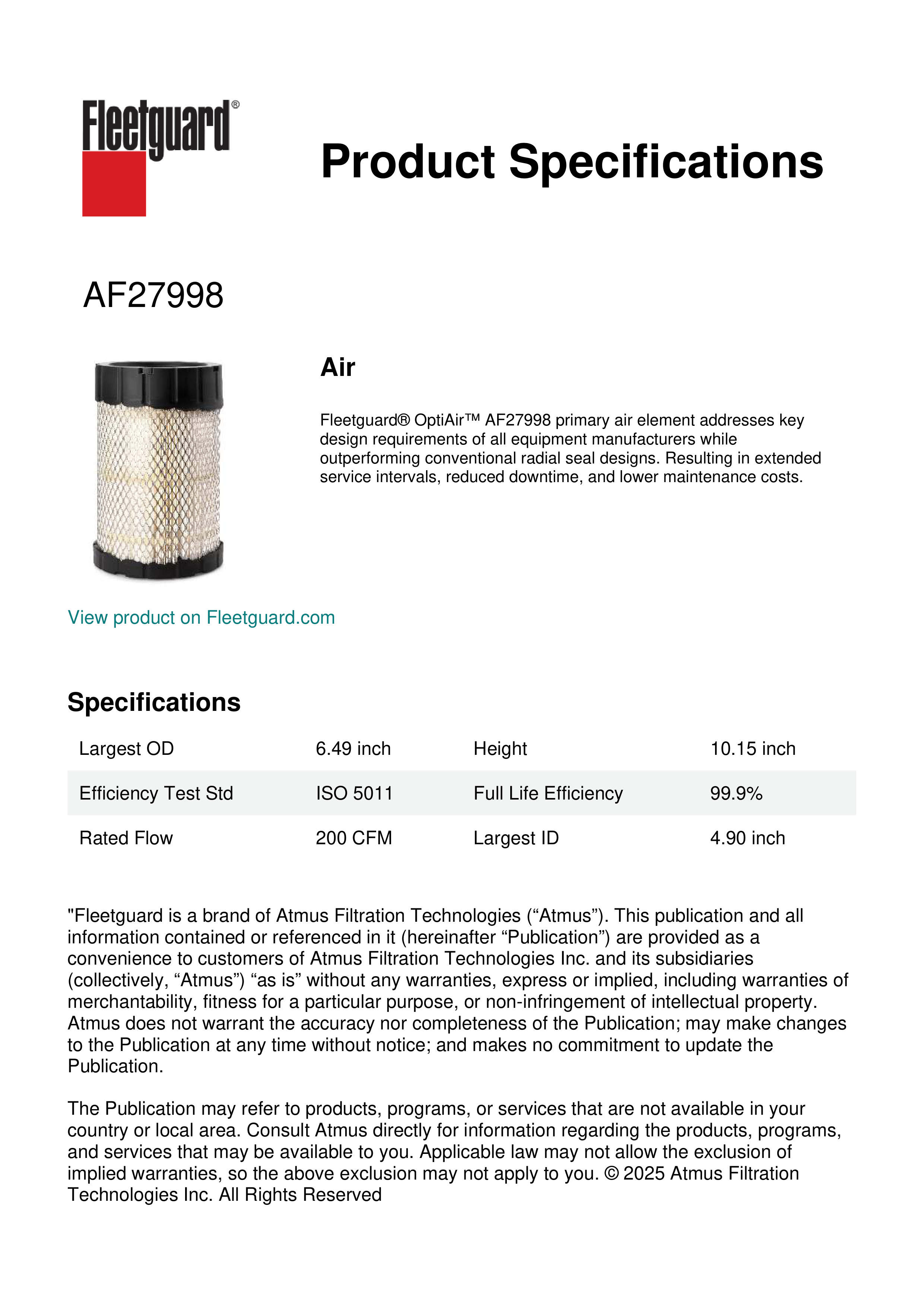 Fleetguard® OptiAir™ AF27998 primary air element addresses key design requirements of all equipment manufacturers while outperforming conventional radial seal designs. Resulting in extended service intervals, reduced downtime, and lower maintenance costs.Specification
