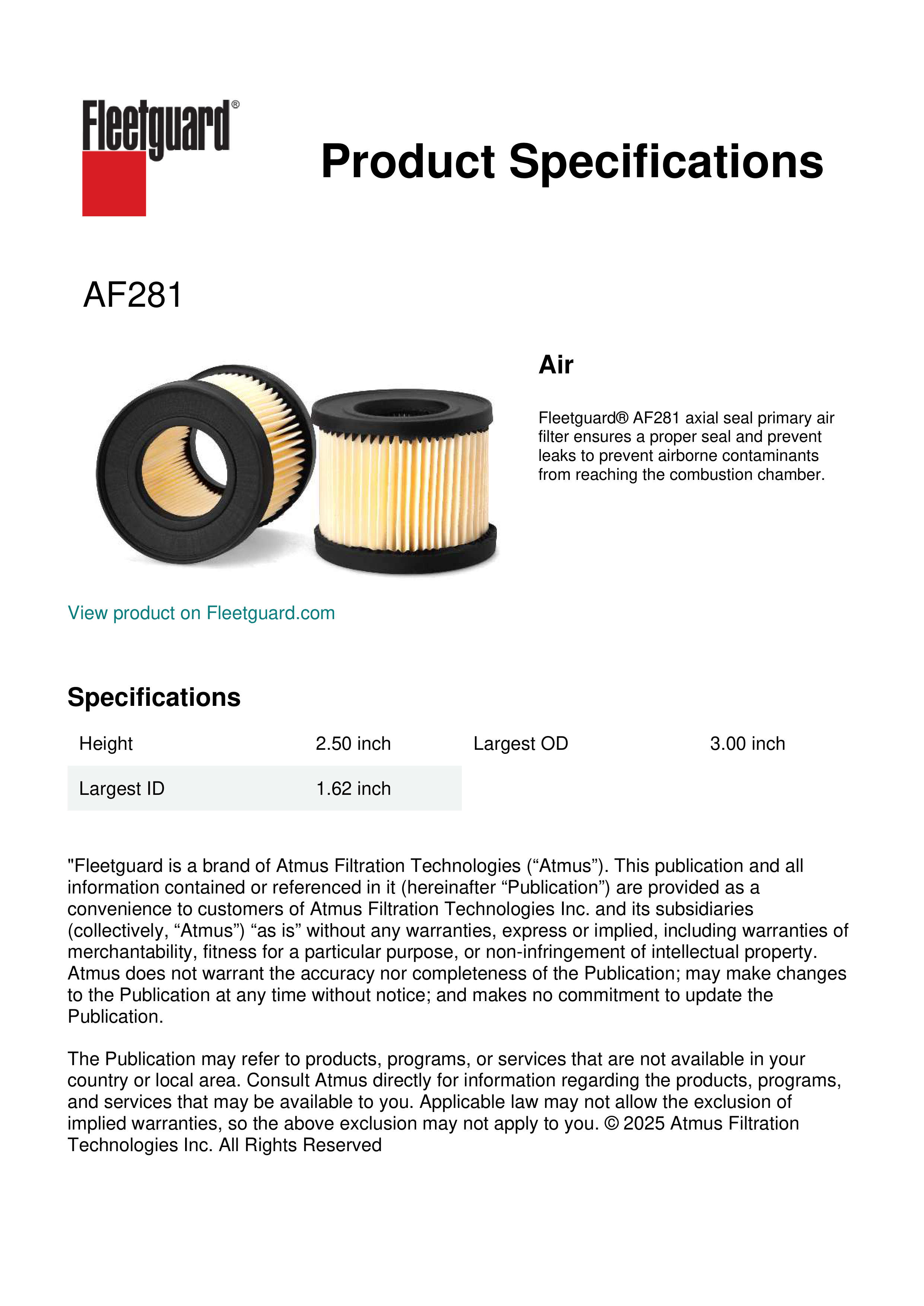 Fleetguard® AF281 axial seal primary air filter ensures a proper seal and prevent leaks to prevent airborne contaminants from reaching the combustion chamber.Specification