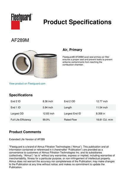 Fleetguard® AF289M axial seal primary air filter ensures a proper seal and prevent leaks to prevent airborne contaminants from reaching the combustion chamber.