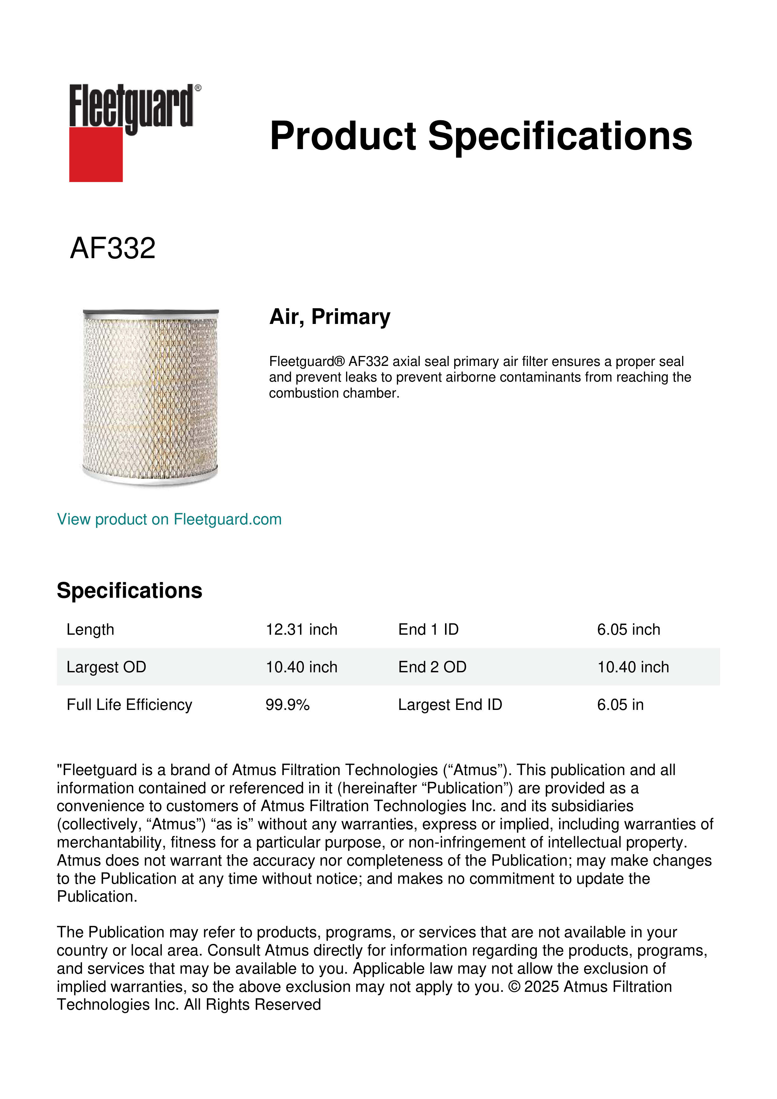 Fleetguard® AF332 axial seal primary air filter ensures a proper seal and prevent leaks to prevent airborne contaminants from reaching the combustion chamber.Specification