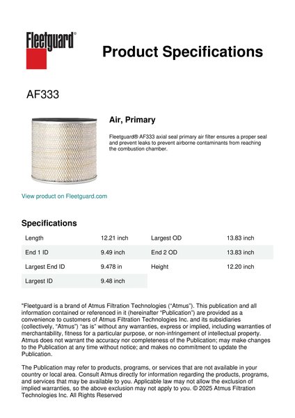 Fleetguard® AF333 axial seal primary air filter ensures a proper seal and prevent leaks to prevent airborne contaminants from reaching the combustion chamber.Specification