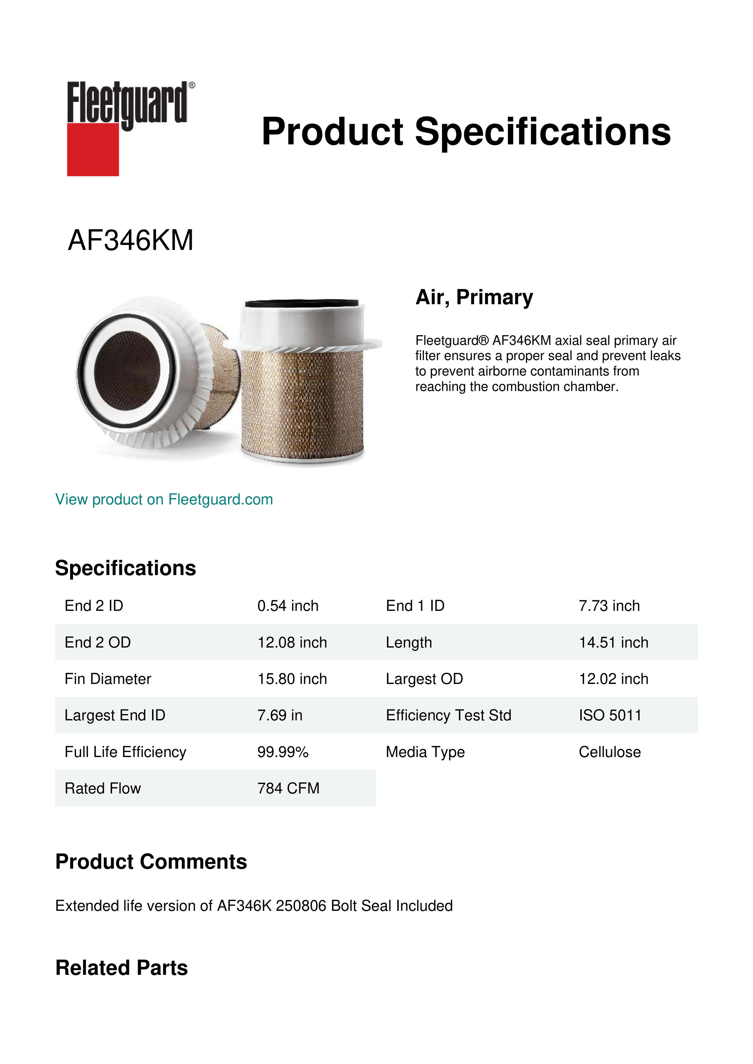 Fleetguard® AF346KM axial seal primary air filter ensures a proper seal and prevent leaks to prevent airborne contaminants from reaching the combustion chamber.