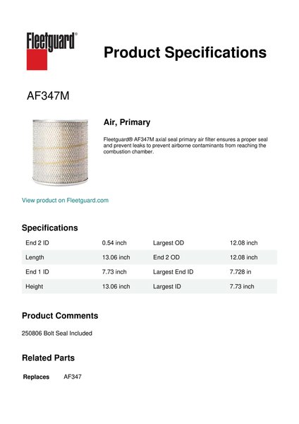 Fleetguard® AF347M axial seal primary air filter ensures a proper seal and prevent leaks to prevent airborne contaminants from reaching the combustion chamber.