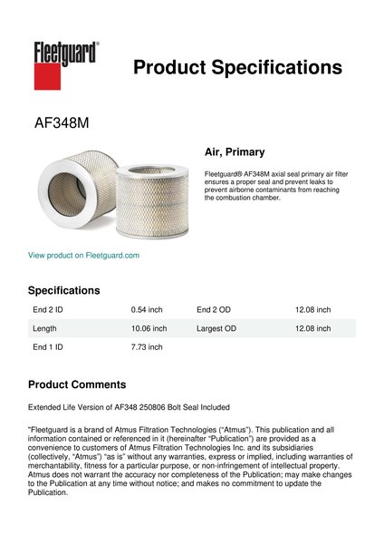 Fleetguard® AF348M axial seal primary air filter ensures a proper seal and prevent leaks to prevent airborne contaminants from reaching the combustion chamber.