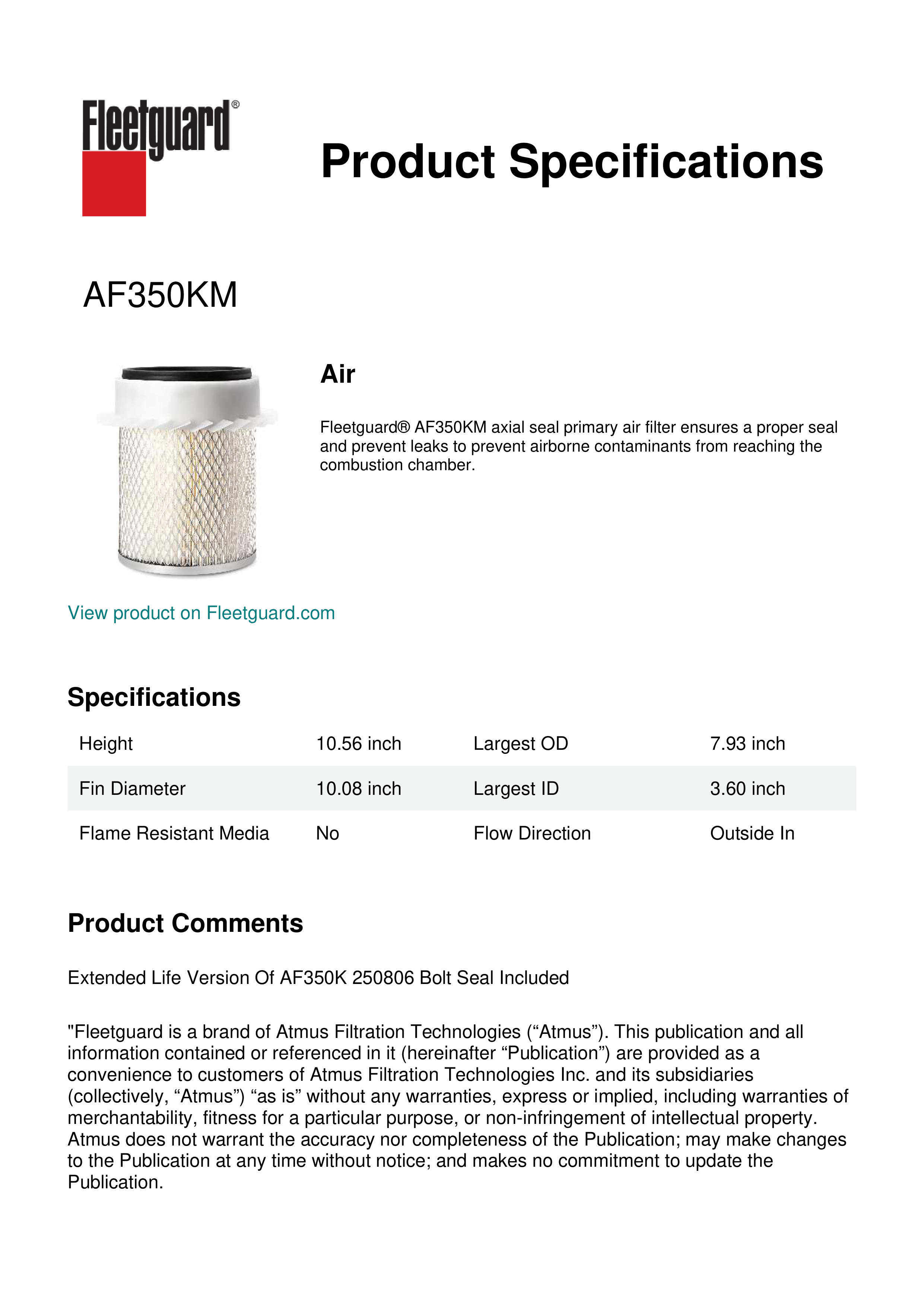 Fleetguard® AF350KM axial seal primary air filter ensures a proper seal and prevent leaks to prevent airborne contaminants from reaching the combustion chamber.Specification