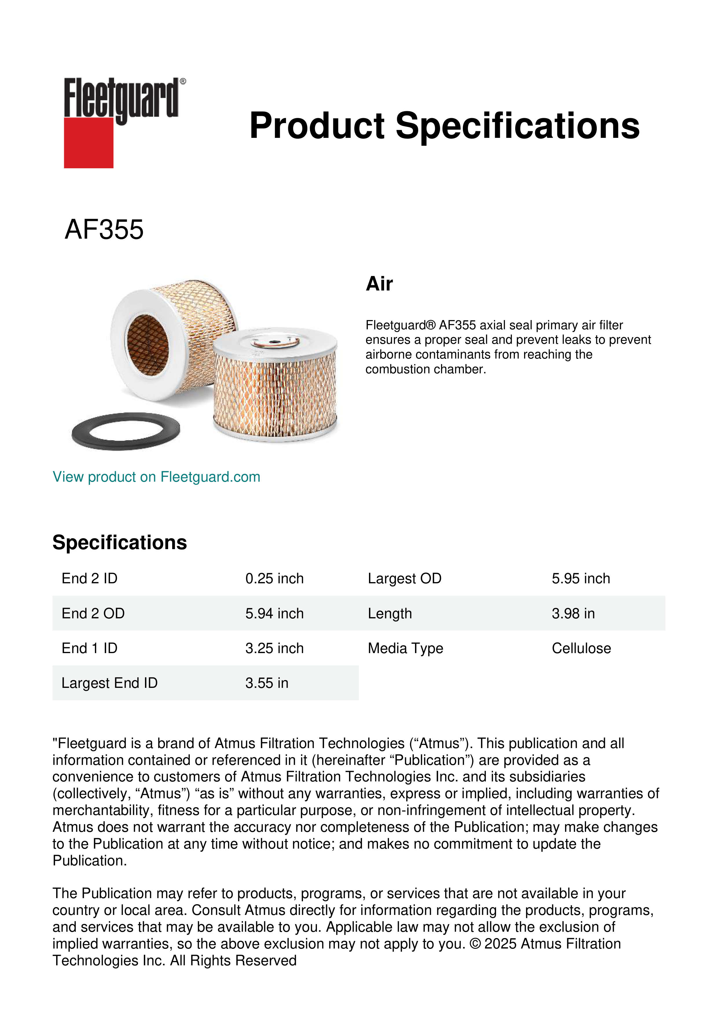 Fleetguard® AF355 axial seal primary air filter ensures a proper seal and prevent leaks to prevent airborne contaminants from reaching the combustion chamber.