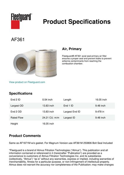 Fleetguard® AF361 axial seal primary air filter ensures a proper seal and prevent leaks to prevent airborne contaminants from reaching the combustion chamber.Specification