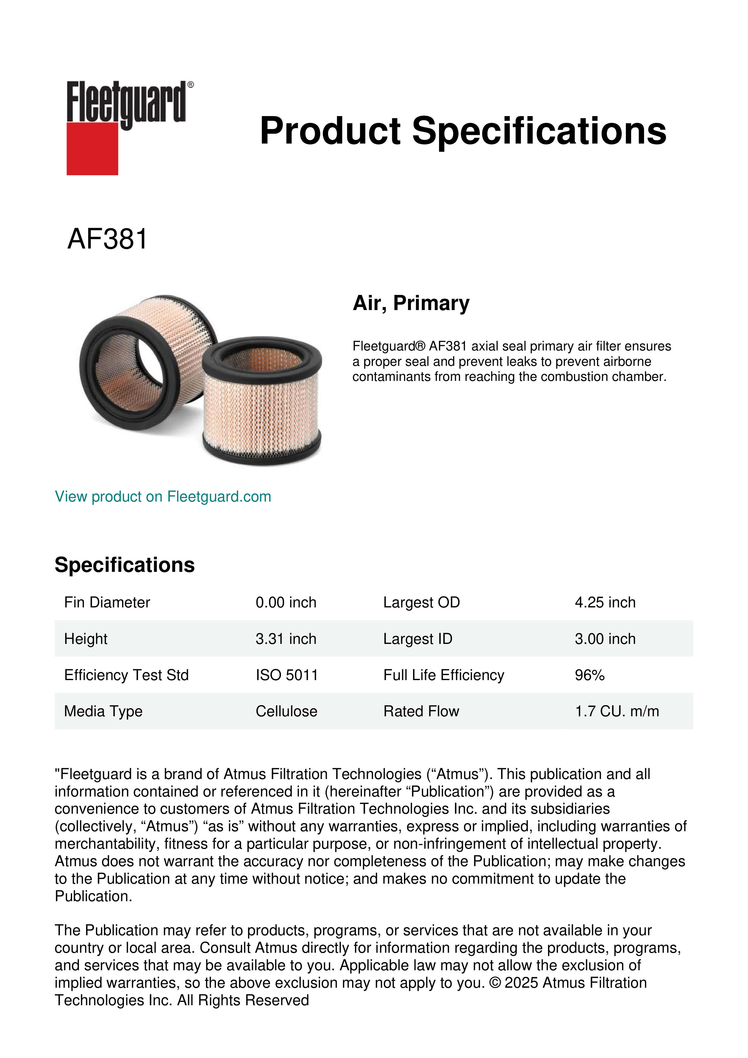 Fleetguard® AF381 axial seal primary air filter ensures a proper seal and prevent leaks to prevent airborne contaminants from reaching the combustion chamber.
