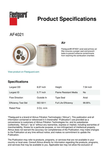 Fleetguard® AF4021 axial seal primary air filter ensures a proper seal and prevent leaks to prevent airborne contaminants from reaching the combustion chamber.