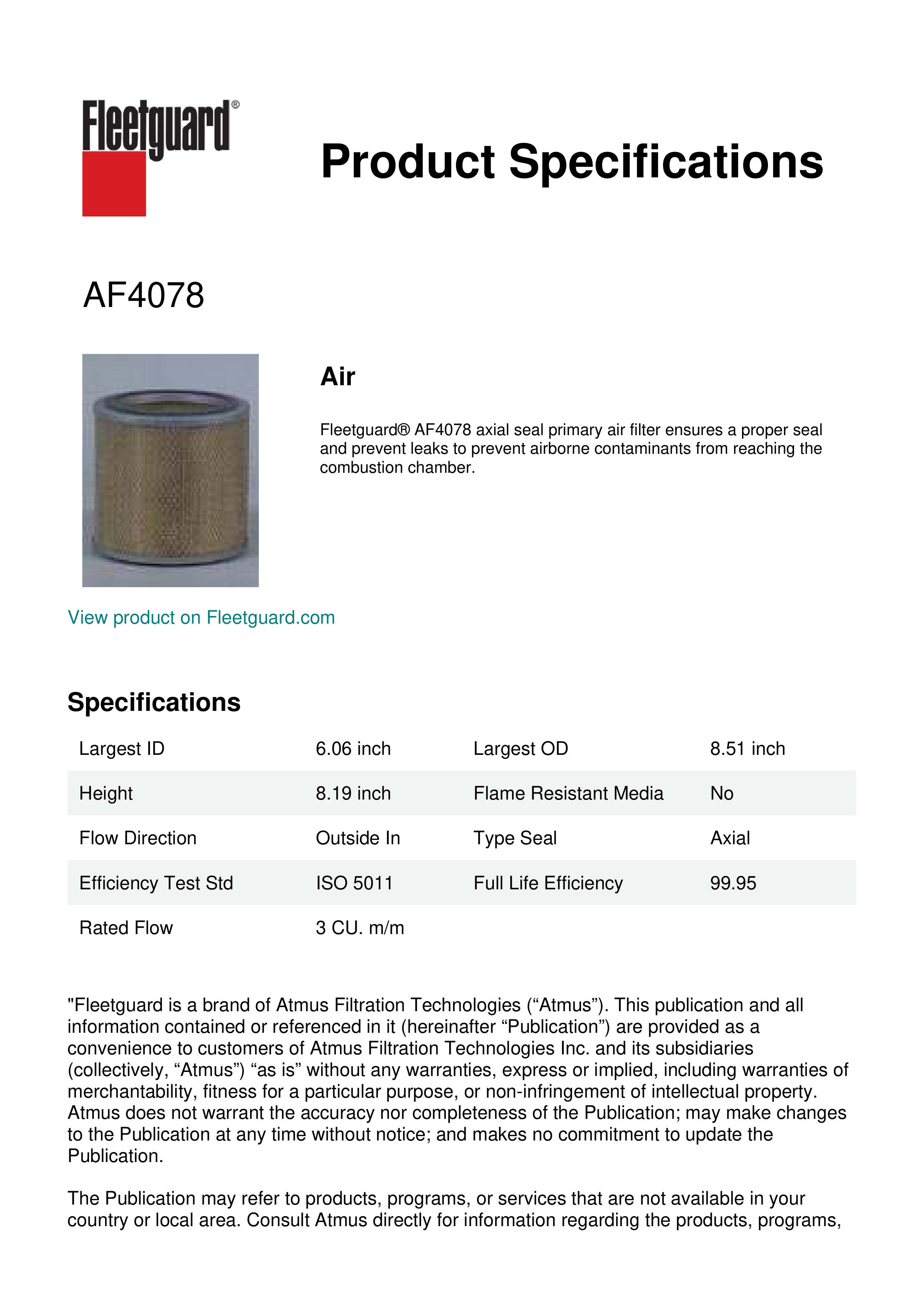 Fleetguard® AF4078 axial seal primary air filter ensures a proper seal and prevent leaks to prevent airborne contaminants from reaching the combustion chamber.