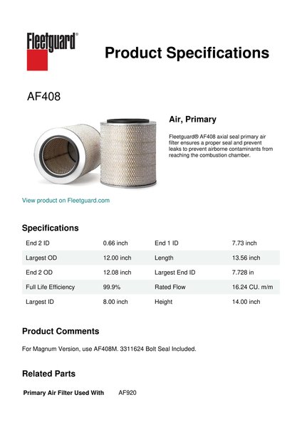 Fleetguard® AF408 axial seal primary air filter ensures a proper seal and prevent leaks to prevent airborne contaminants from reaching the combustion chamber.